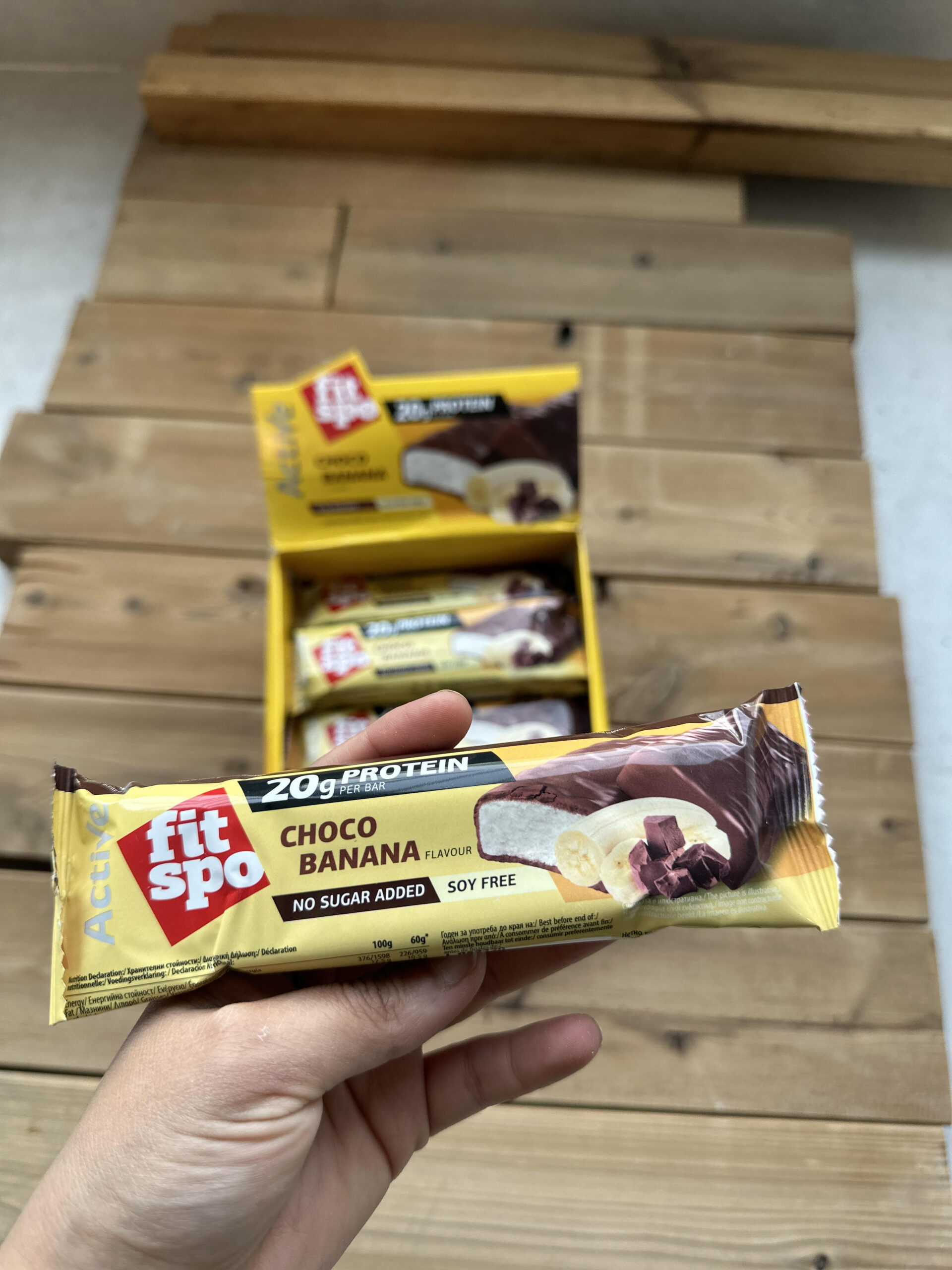 پروتئین بار fit spo با طعم شکلات موز حاوی 20 گرم پروتئین و بدون سویا می باشد.