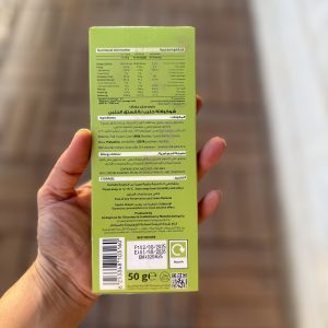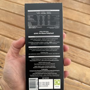 محتویات: کاکائو، کاکائو کم چربی، کره کاکائو، شکر دمرارا (شکر زرد و درشت). ممکن است حاوی آجیل، شیر و سویا باشد.