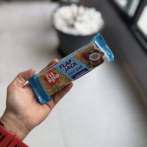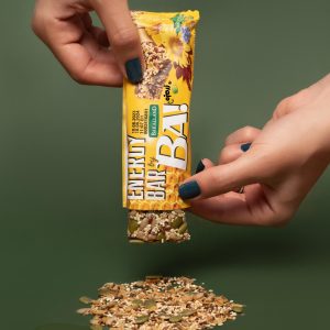 این انرژی بار یک میان وعده مقوی است که از ترکیب خرما، کشمش و بادام زمینی و روکش شکلات شیری ریخته شده تهیه شده است .